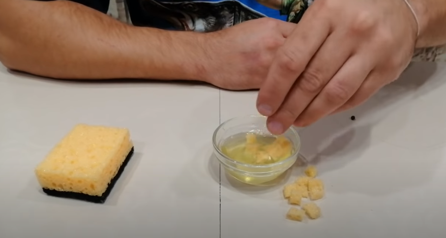 И еще нам понадобиться любой поролон. Я взял обычную губку для мойки посуды, ножницами нарезал не большие кубики, окунул их в наш белок. Нужно хорошенько пропитать их пальцами в белке.