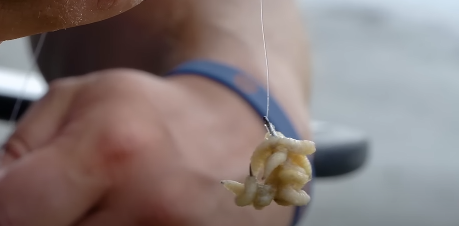 Итак, берем крючок и классическим способом насаживаем на него максимальное количество опарышей, которые поместится. Насаживаем по-разному посерединке, с одного края, с другого, и у нас получается вот такая большая шевелящая насадка.