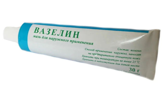 Приступаем к приготовлению. Берём вазелин, выдавливаем весь тюбик в стакан. Тюбик не выбрасываем, он ещё нам пригодится. Туда же добавляем пару щепоток пищевой соды. Тщательно размешиваем, чтобы крупицы соли исчезли. Затем берём корм для рыбок. Я беру по одной столовой ложки - того и того.